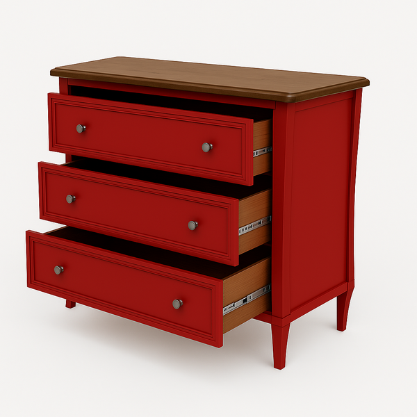 Cômoda Amsterdã conta com 3 gavetas com corrediça telescópica e puxadores metálicos, feita em madeira maciça de reflorestamento, com acabamento em verniz acetinado em tons de madeira e laqueado em tons coloridos.