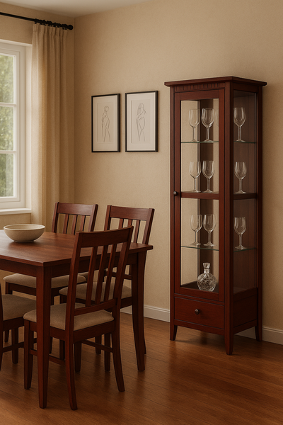 A cristaleira Colonial possui 1 porta de vidro, laterais de vidro e fundo espelhado, 1 gaveta com corrediças telescópicas e 3 prateleiras de vidro. Ótima para prencher aquele espaço vazio, com muito charme!