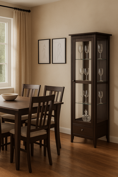 A cristaleira Colonial possui 1 porta de vidro, laterais de vidro e fundo espelhado, 1 gaveta com corrediças telescópicas e 3 prateleiras de vidro. Ótima para prencher aquele espaço vazio, com muito charme!
